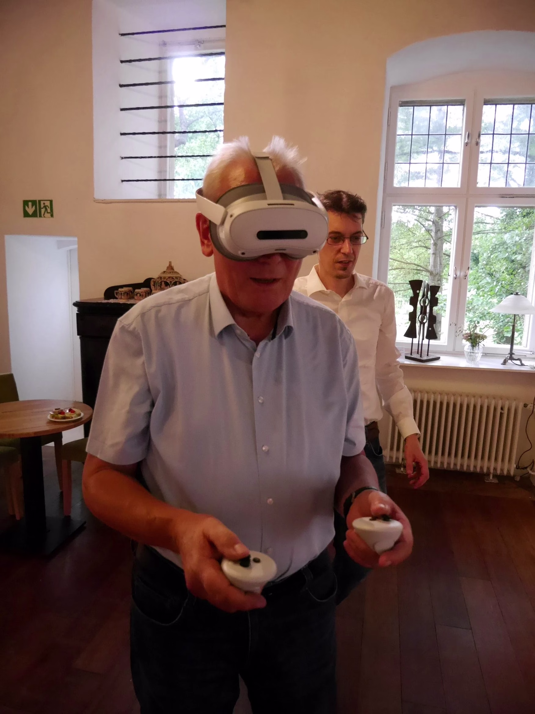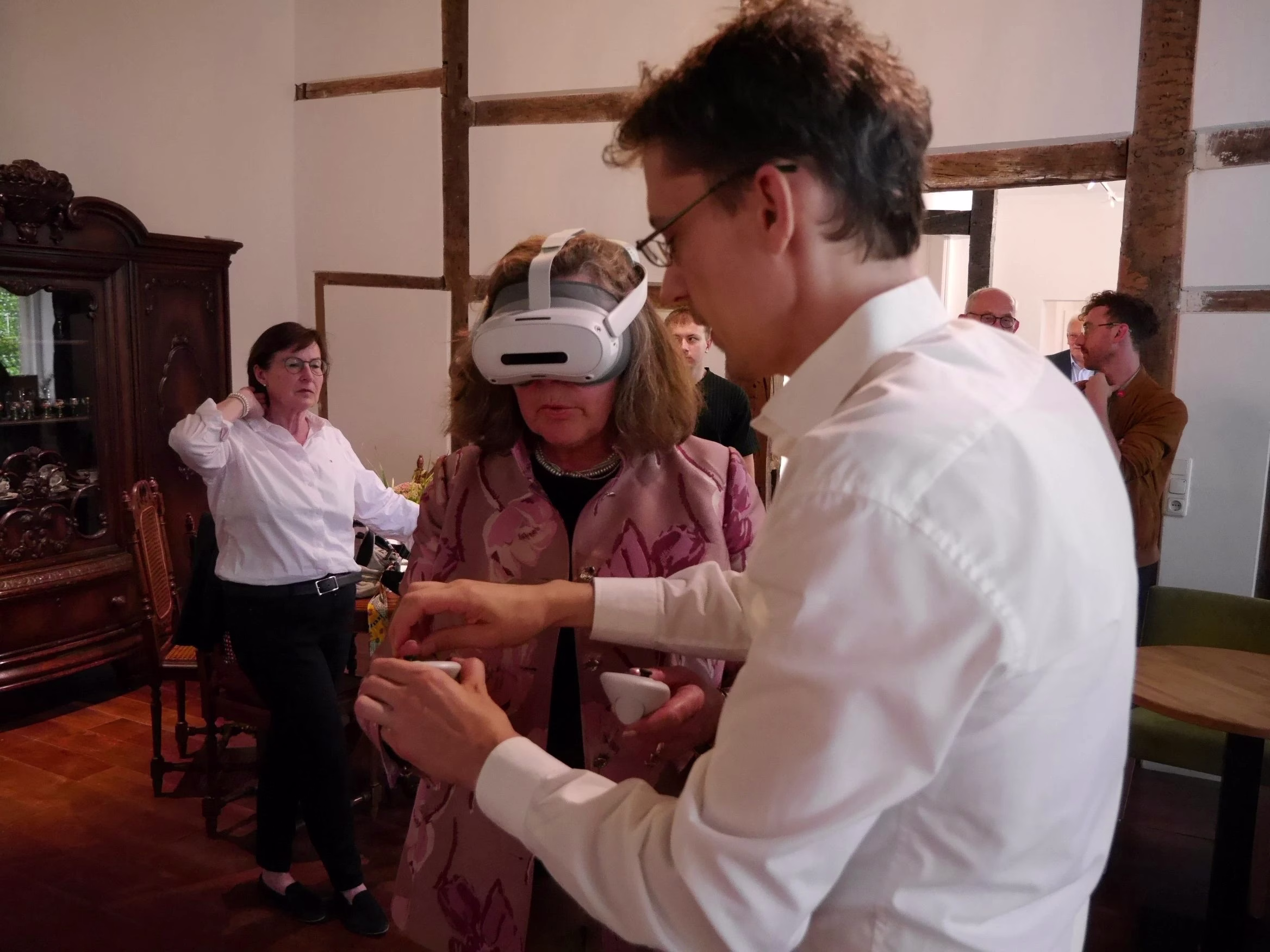 In Anwesenheit der beiden  Förderer des Projektes Stefan Ast, Geschäftsführer der NRW Stiftung, Tobias Marx, Leiter der Scharnhorster Verwaltungsstelle, sowie Stadtheimatpfleger Dr. Mathias Austermann und Bezirksbürgermeister Werner Gollnick wurde danach, durch Dr. Benjamin Weber der Firma XRBit, das Ergebnis des VR-Projektes „Digitale Begehung des Wenge-Dachbodens“ und des virtuellen 360-Grad-Spaziergangs durch Haus Wenge präsentiert.