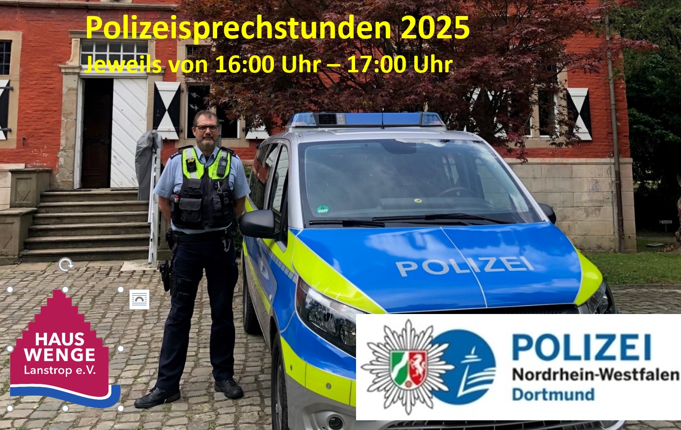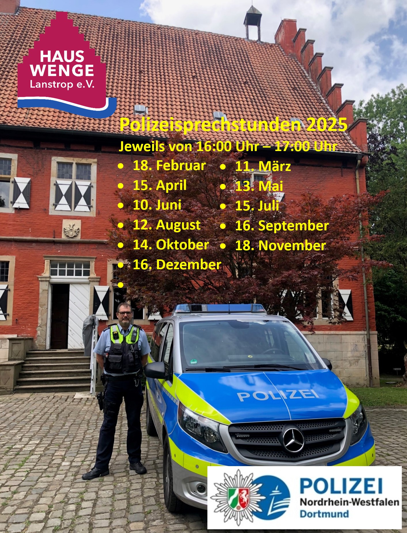 Ab Dienstag, d. 18. Februar starten wieder unsere Polizeisprechstunden mit Polizeihauptkommissar Frank Kirchhoff in Haus Wenge. Eine Anmeldung ist nicht notwendig. Die Sprechstunde, in der Zeit von 16:00 – 17:00 Uhr, findet in der Tauschbücherei im Max-von-der-Grün-Zimmer im Erdgeschoss statt. Alle anderen Sprechstundentermine 2025, die Sie dem Plakat entnehmen können, finden ebenfalls an einem Dienstag statt.