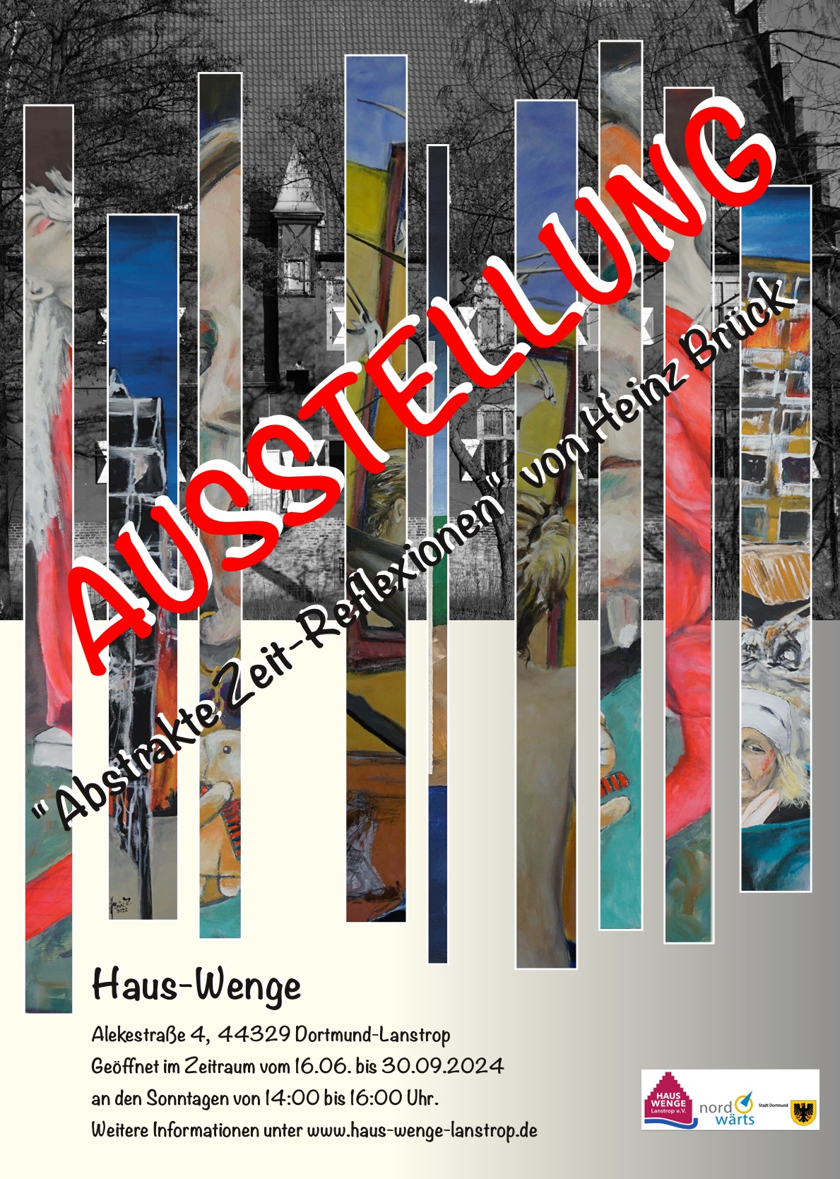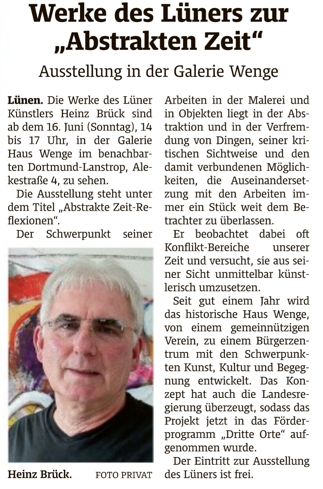 Mit dem in Lünen wohnenden und in Lanstrop geborenen Künstler Heinz Brück ging es  in die nächste Ausstellungszeit in der Galerie Wenge. Der Kunsthistoriker Dr. Heinrich Schulze Altcappenberg übernahm dabei für seinen Freund die fachliche Eröffnung mit der Vernissage am 16. Juni 2024. Ein Geschenk gab es dabei noch vom Derner Künstler Fern Mehring, der ein Bild von Max von der Grün aus seiner Sammlung an Matthias Hüppe vom Wengeverein übergab.