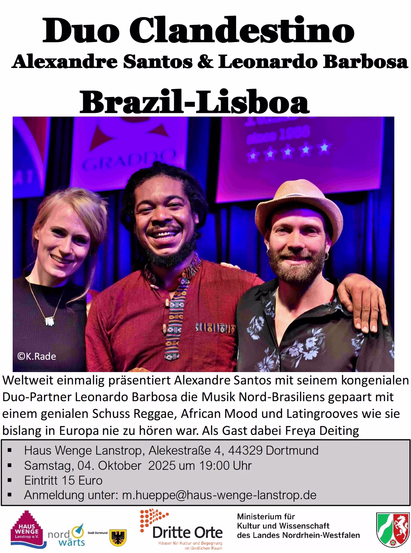 Weltweit einmalig präsentieren in Haus Wenge Clandestino – Alexandre Santos mit seinem kongenialen Duo-Partner Leonardo Barbosa – die Musik Nord-Brasiliens gepaart mit einem genialen Schuss Reggae, African Mood und Latingrooves wie sie bislang in Europa nie zu hören ist.