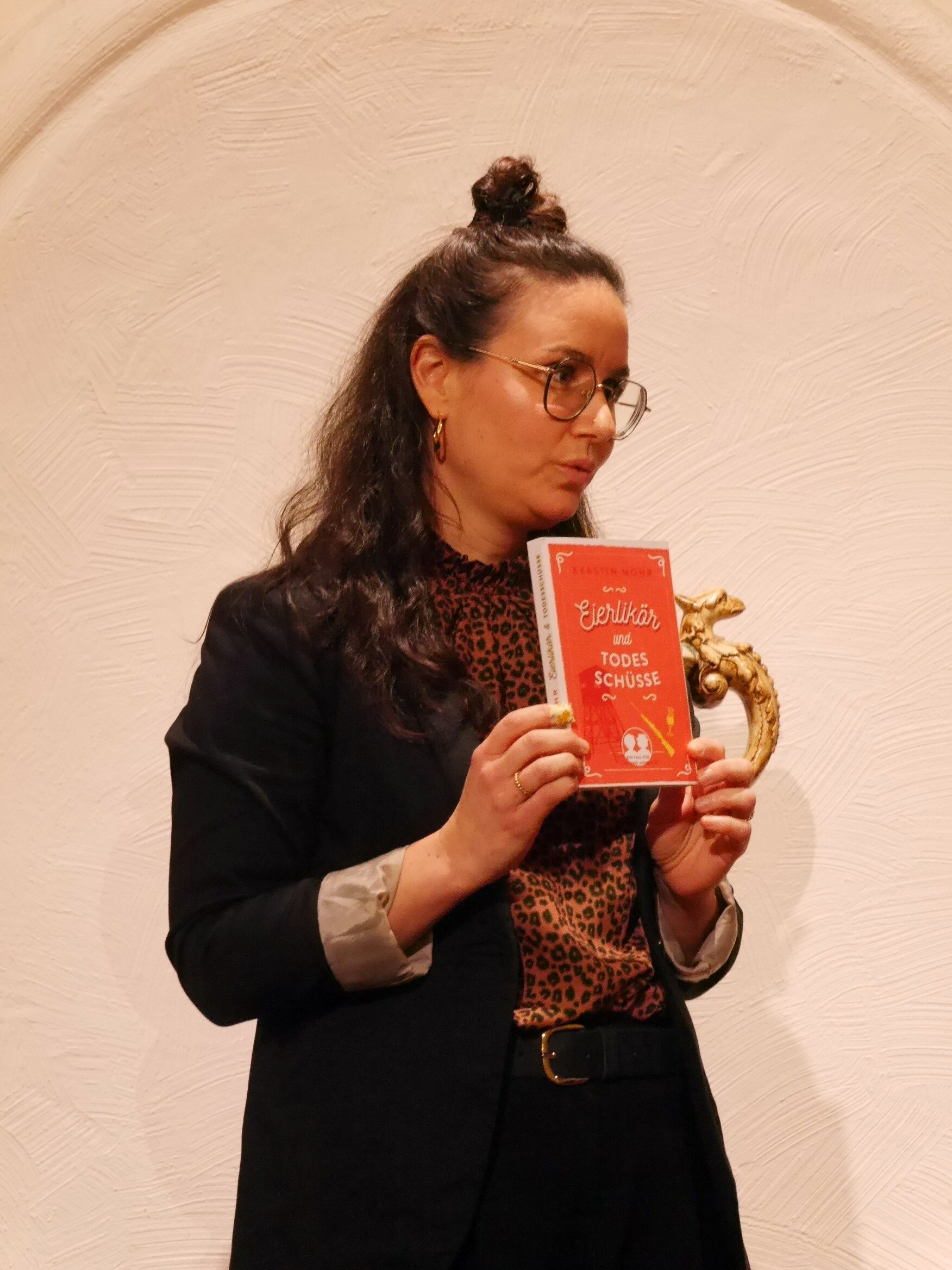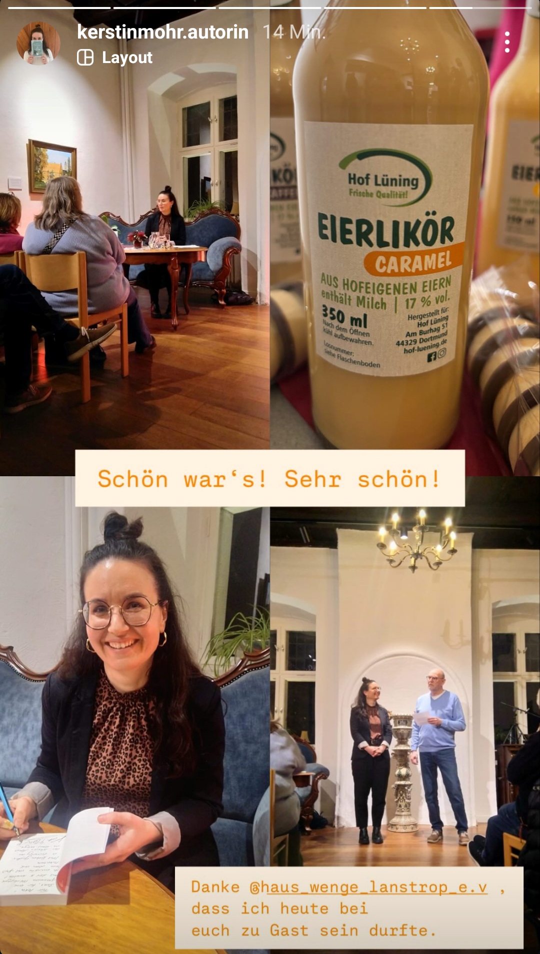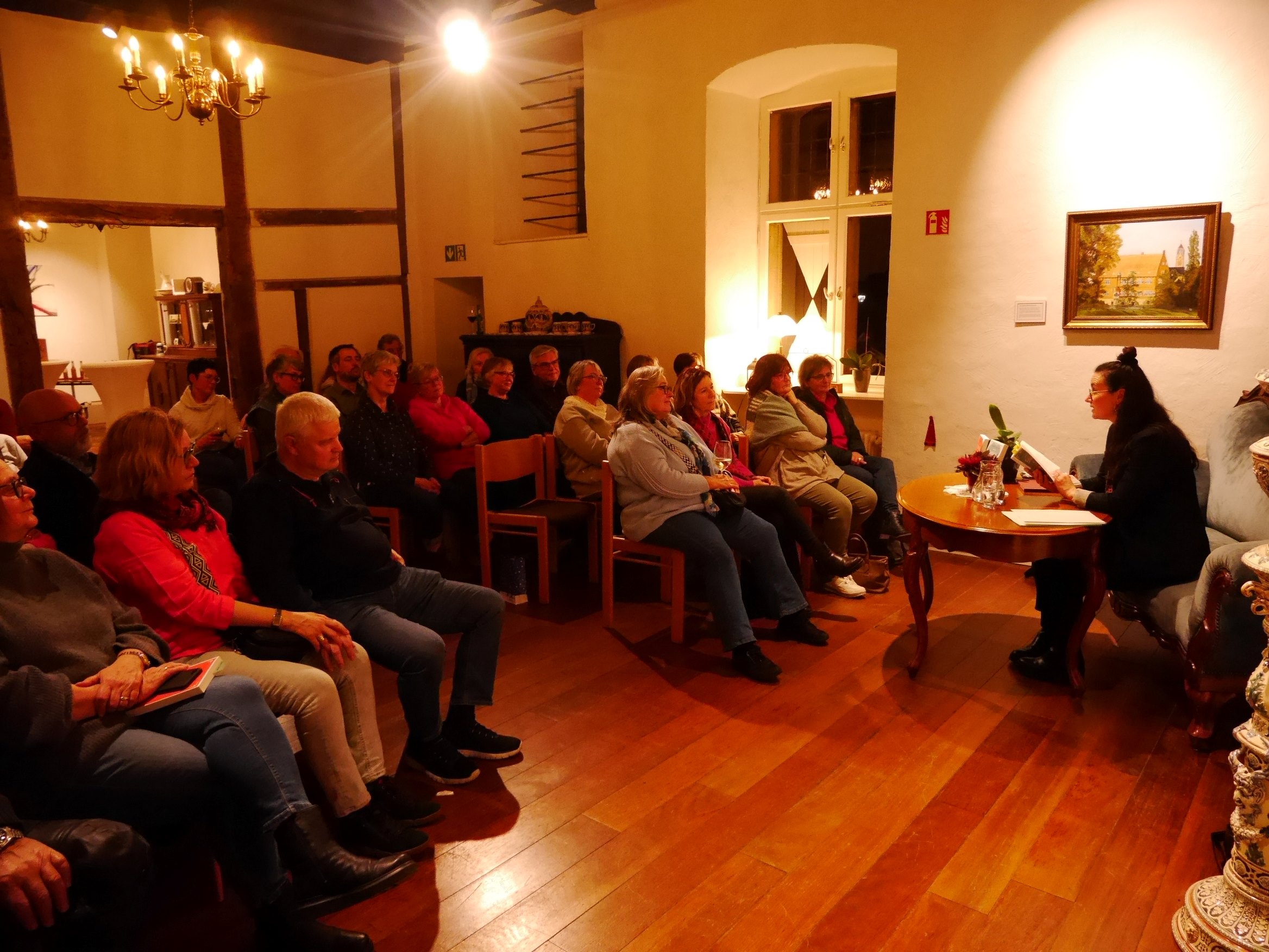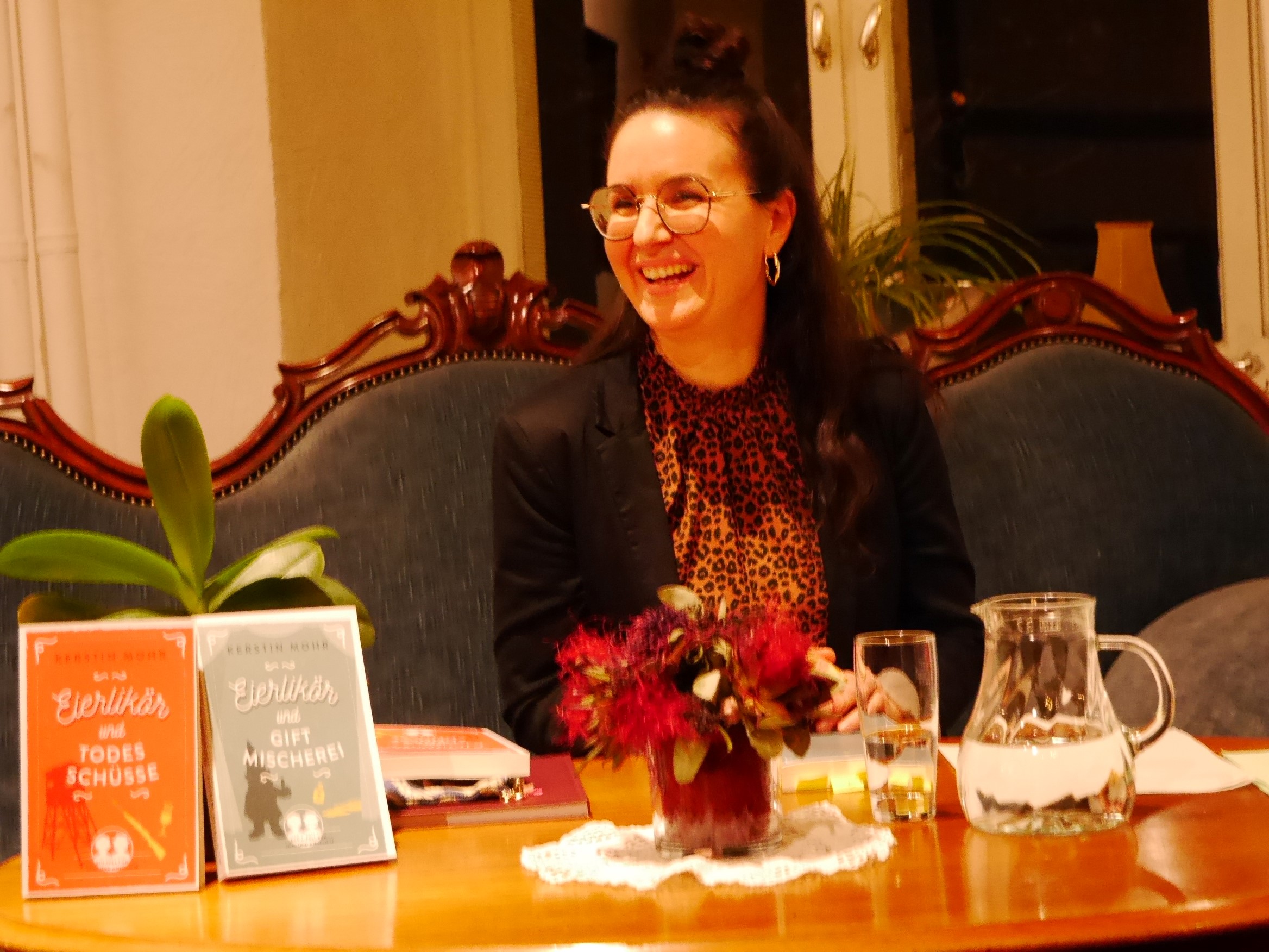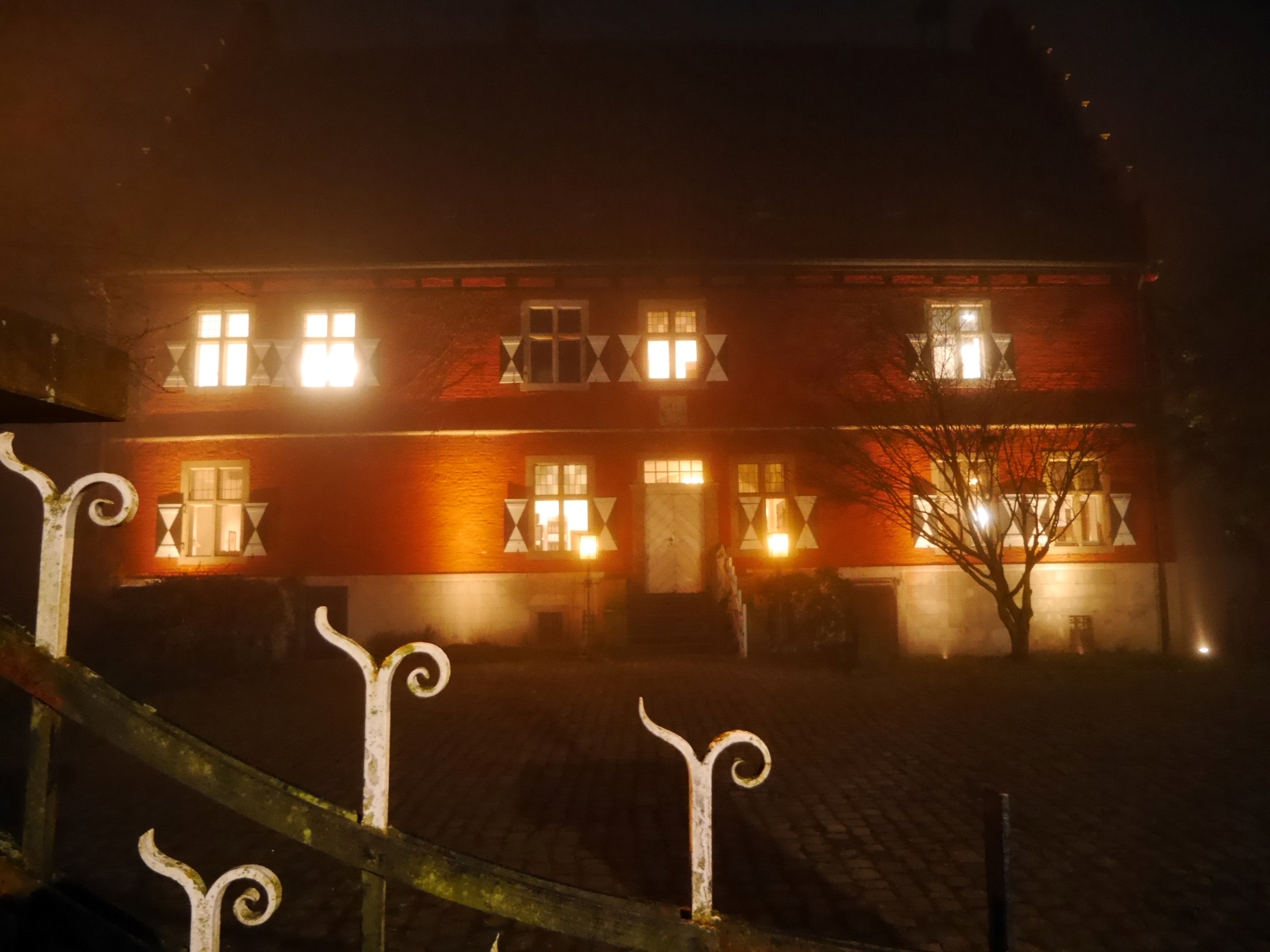Es war wie eine Szene aus einem alten Edgar-Wallace-Film. Haus Wenge war in dichte Nebelschwaden gehüllt, als am 17. Januar die Krimilesung mit der Autorin Kerstin Mohr und ihrem Ermittlerpaar Anneliese und Loni startete. Da Anneliese und Loni bei ihren Ermittlungen in einem kleinen Ort im Hunsrück gerne mal einen Eierlikör trinken, hatte Matthias Hüppe vom Haus Wenge Verein auch jede Menge Eierlikör vom Bauernlädchen Lüning besorgt. Und diesem Angebot konnten die zahlreichen Gäste dann auch nicht widerstehen. Die Krimiautorin Kerstin Mohr hatte bei ihrer Lesung den Saal mit ihrer sympathischen Art gleich auf Ihrer Seite. Hochinteressant waren insbesondere auch die persönlichen Einblicke in die Entstehungsgeschichte ihrer Bücher. Zum Schluss gab es dann natürlich vom Haus Wenge eine Flasche Lanstroper Eierlikör – Marke Sanddorn.