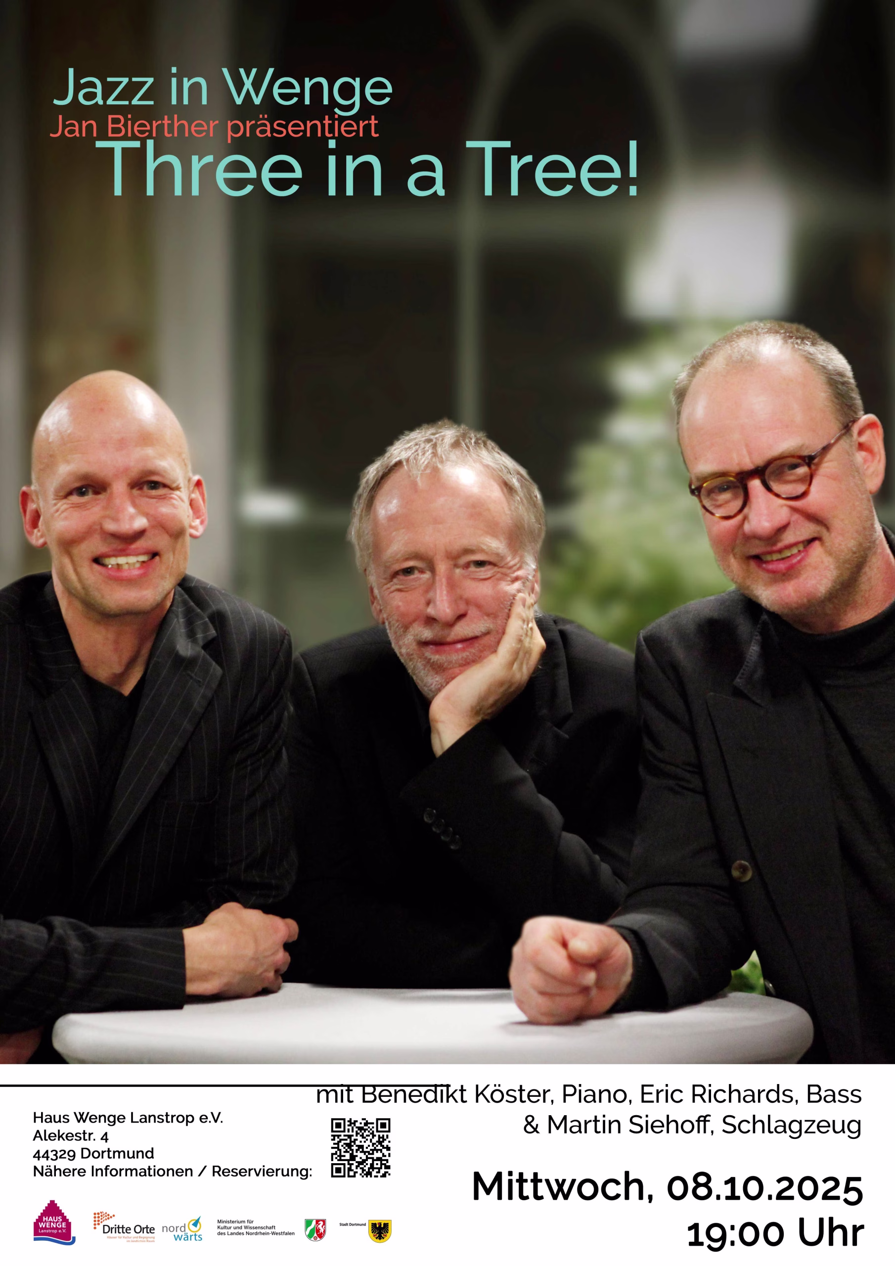 Das Trio Three In A Tree bereichert die unzähligen Klaviertrios dieser Welt durch einen unverwechselbaren Sound mit Stücken aus der Feder des Bandleaders Benedikt Koester und eigenen Arrangements ausgesuchter Standards. Als Dozent an der Hochschule für Musik Detmold und an der TU Dortmund / Institut für Musik und Musikwissenschaft prägt er die Szene seit Jahrzehnten. Three In A Tree hat seit 2008 unzählige Konzerte auf Festivals, Kongressen und in diversen Gastronomien gespielt und leitet seit Jahren eine eigene Konzertreihe in Schwerte/Ruhr, bei dem das Trio immer wieder mit anderen Solisten zusammen arbeitet. Benedikt Koester: E-Piano, Jan Bierther: Gitarre, Eric Richards, Bass, Martin Siehoff, Schlagzeug.