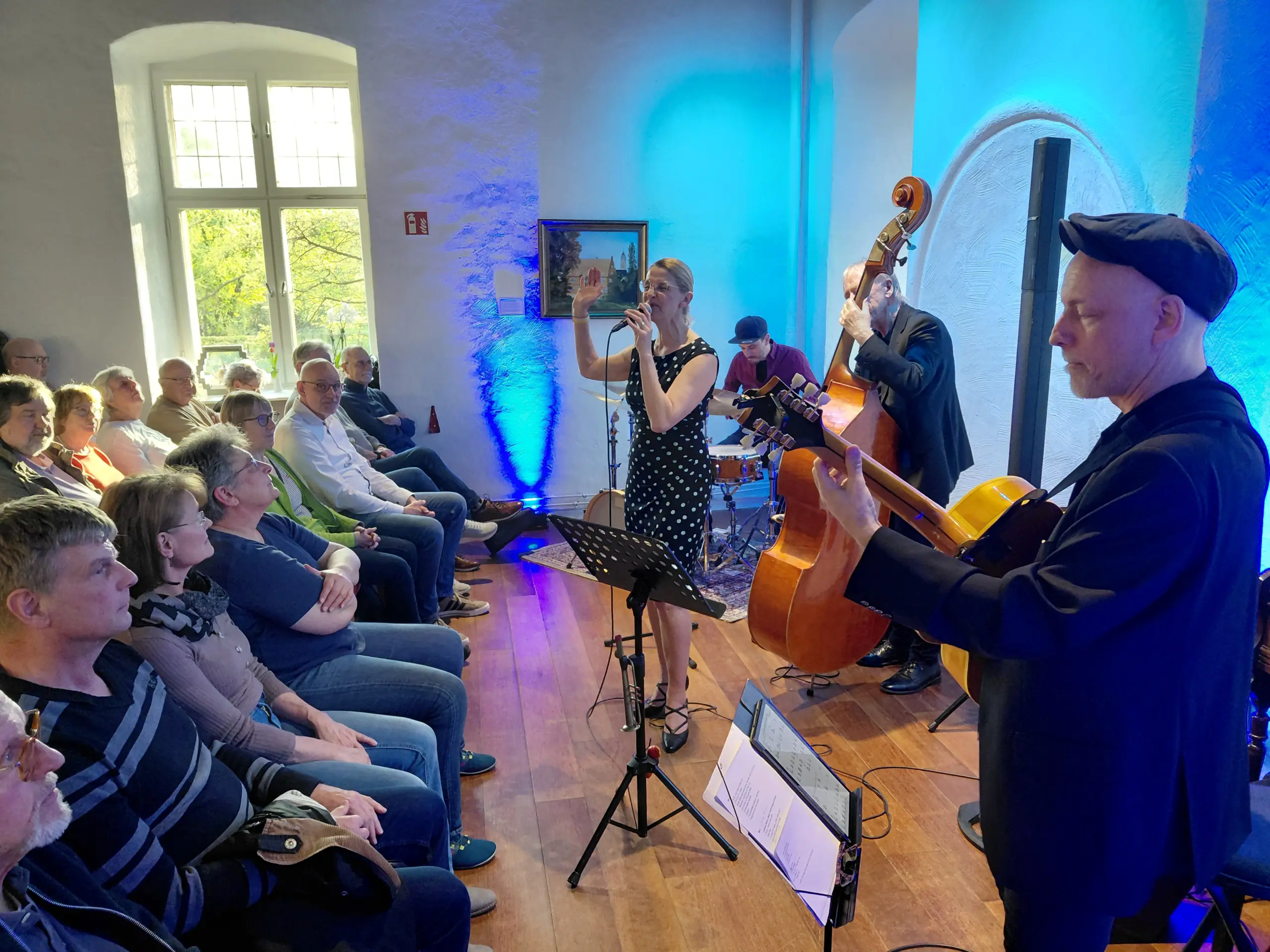 Daniela Rothenburg nutzte das phantastische Ambiente und dichte Atmosphäre im kleinen Saal von Haus Wenge, um immer auch mit dem Publikum zu interagieren und es in die vielfältigen Gesangsnummern einzubeziehen.