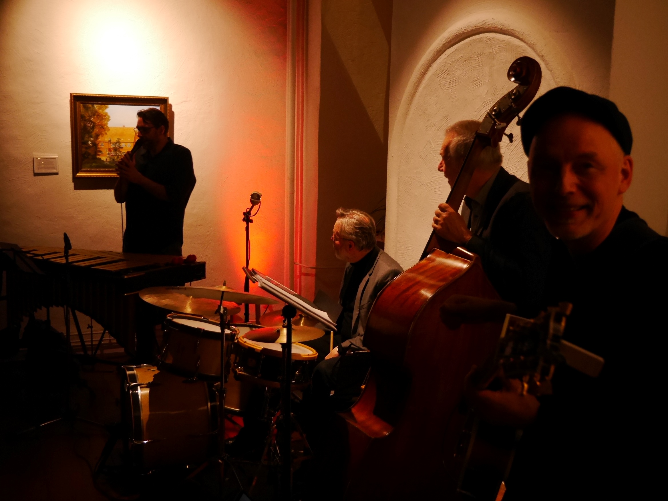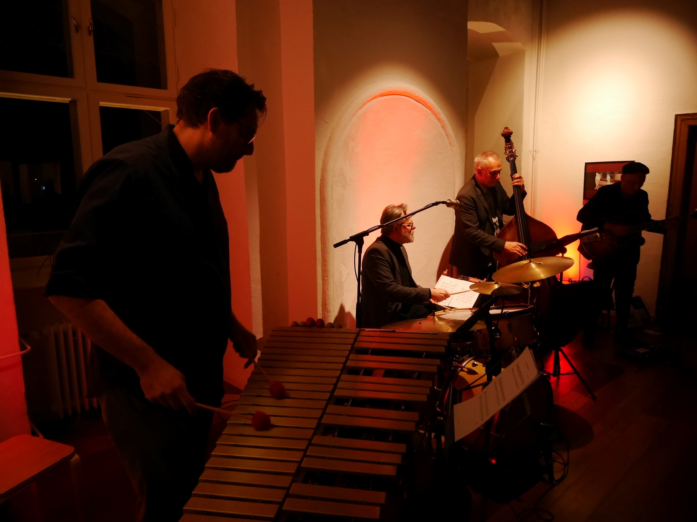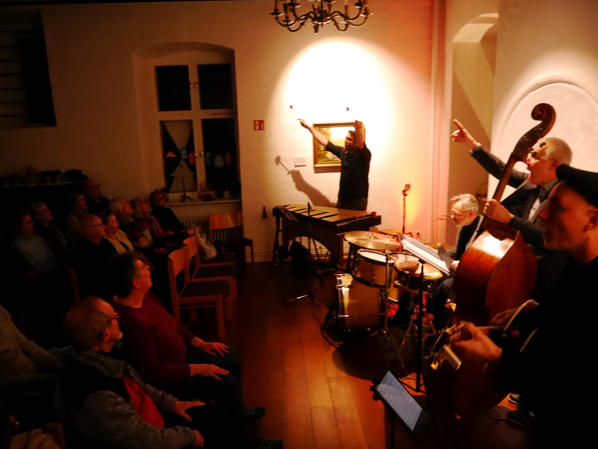Jan Bierther, als künstlerischer Leiter der Jazz-Reihe, hatte diesmal gleich drei neue Musiker dabei. Ben Bönniger am Schlagzeug und Walfried Böcker am Bass komplettierten diesmal das Jan Bierther Trio. Als Gast dabei, der Jazz-Vibraphonist Matthias Strucken, der u. a. als Lehrbeauftragter für Vibraphon an den Musikhochschulen Köln und Osnabrück tätig ist. Als Künstler arbeitete er schon mit DJ Bobo, Bill Ramsey, Paul Kuhn oder Bobby McFerrin zusammen. Nach dem Intro gestand er grinsend, dass er eigentlich mal Lehrer werden wollte und erklärte zunächst einmal, wie genau eigentlich ein Vibraphon funktioniert. „Bitte aufpassen, ich frage das später ab!“