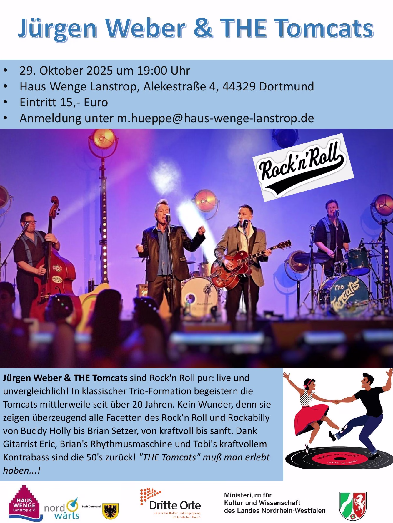 Wow! Jürgen Weber & The Tomcats in Haus Wenge. Das war Rock’n Roll pur- live und unvergleichlich! In klassischer Trio-Formation begeistern die Tomcats mittlerweile seit über 20 Jahren. Kein Wunder, denn sie zeigen überzeugend alle Facetten des Rock’n Roll und Rockabilly von Buddy Holly bis Brian Setzer, von kraftvoll bis sanft. Dank Gitarrist Eric, Brians Rhythmusmaschine und Tobis kraftvollem Kontrabass sind die 50’s und 60`s zurück! Dazu Frontmann Jürger Weber, der die Gäste mit seiner Stimme und mit seinen Anekdoten zu den Songs und den Interpreten mit auf eine musikalische Zeitreise nahm.