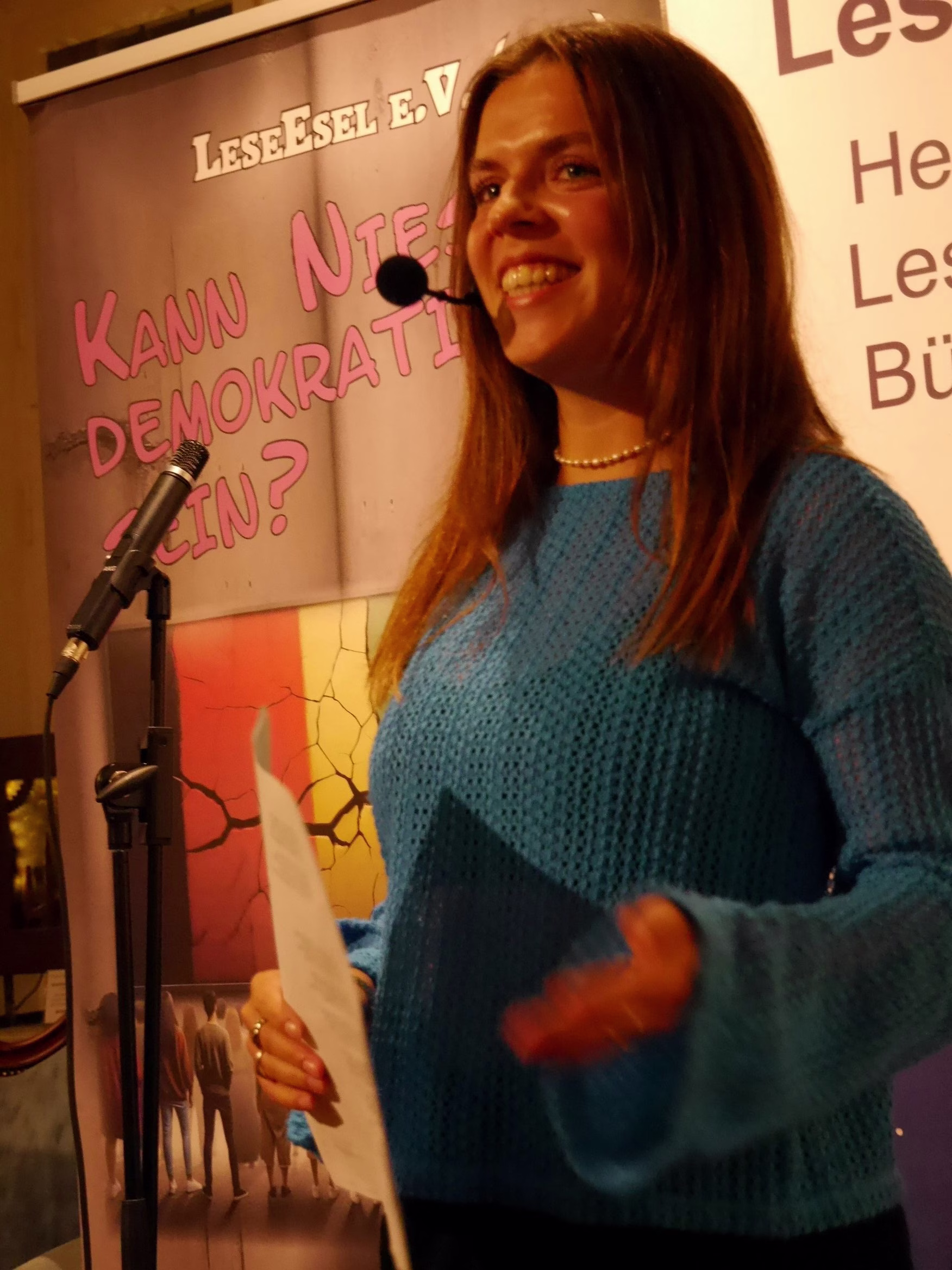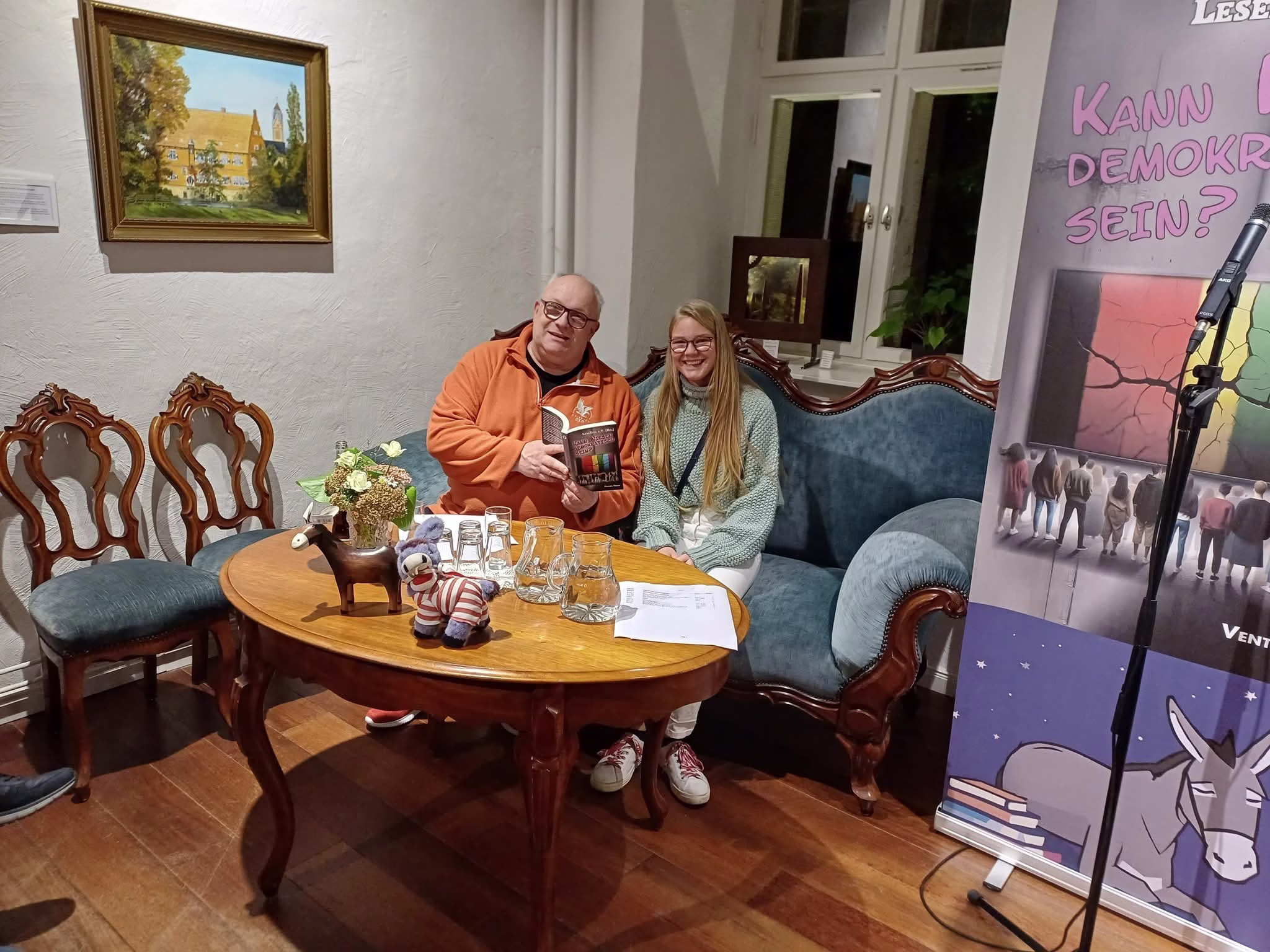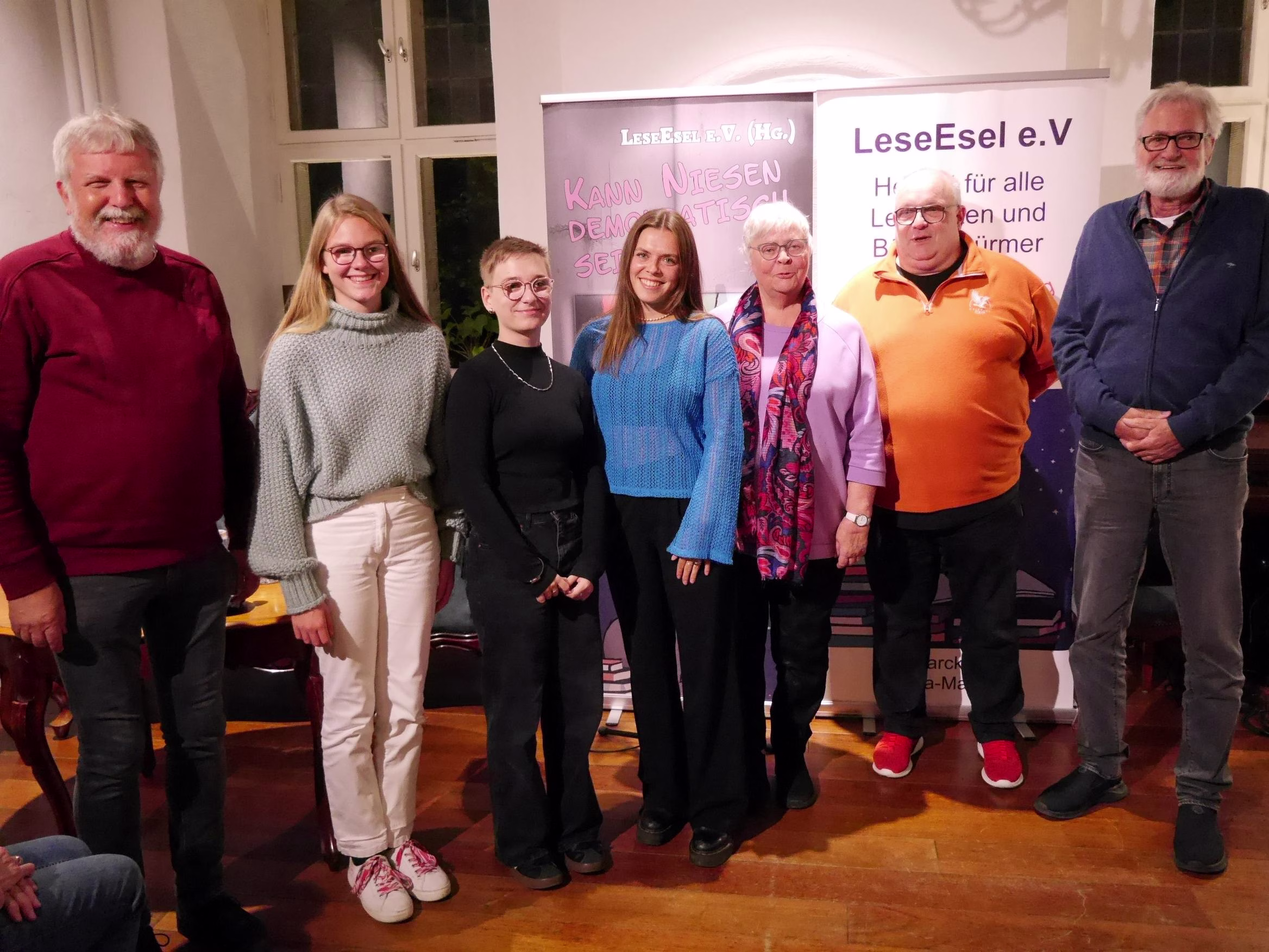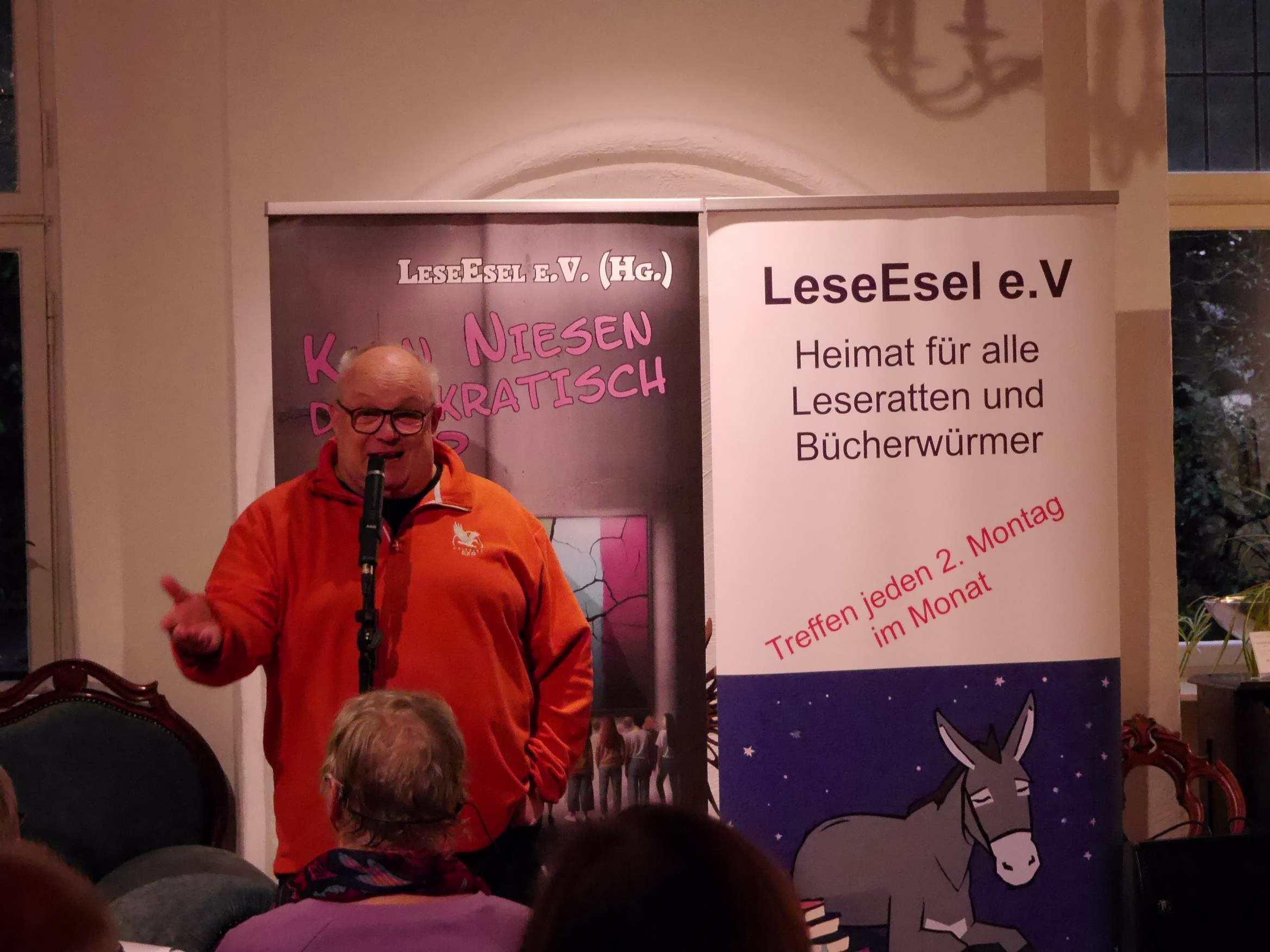 „Kann Niesen demokratisch sein?“ Unter diesem Titel stand der wunderbare und wichtige Literaturabend in Haus Wenge, der zusammen mit dem LeseEsel e. V. aus Unna durchgeführt wurde. Unter der launigen und gefühlvollen Moderation von Dr. Frank Brandstätter, stellten junge und ältere Menschen Texte und Gedichte vor, die sich mit ihren Ideen zum Thema Demokratie befassten. All diese Texte von Menschen im Alter von 9 bis 90 Jahren sind in dem Buchprojekt des LeseEsels „Kann Niesen demokratisch sein?“ zusammengefasst.