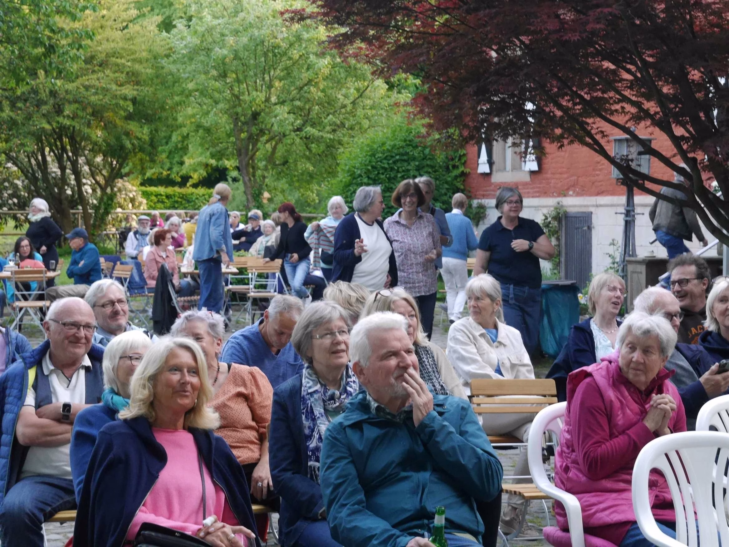 Das Repertoire von Ervardo und Band umfasst, neben eigenen Titeln, Interpretationen aus der Cantautori-Szene Italiens à la Paolo Conte, Domenico Modugno, Gianmaria Testa, Lucio Dalla, Edoardo Bennato, Renato Carosone, und anderen Künstlern. Im ersten Teil des Konzerts standen jedoch die „Songs ro remember“ auf dem Programm. Dazu gehörte natürlich auch Böhmers ganz eigene Version von „You´ll never walk alone“. Neu war diesmal, dass Herwarth Böhmer für einige Songs seine Tochter Clara Schamp auf die Bühne holte, die mit ihrer Stimme, den gemeinsam gesungenen Songs, ihren ganz eigenen Stempel aufdrückte. Aber auch für das leibliche Wohl war gesorgt. Die Initiative Angekommen hatte wieder einmal viele Leckereien und kalte Getränke vorbereitet.