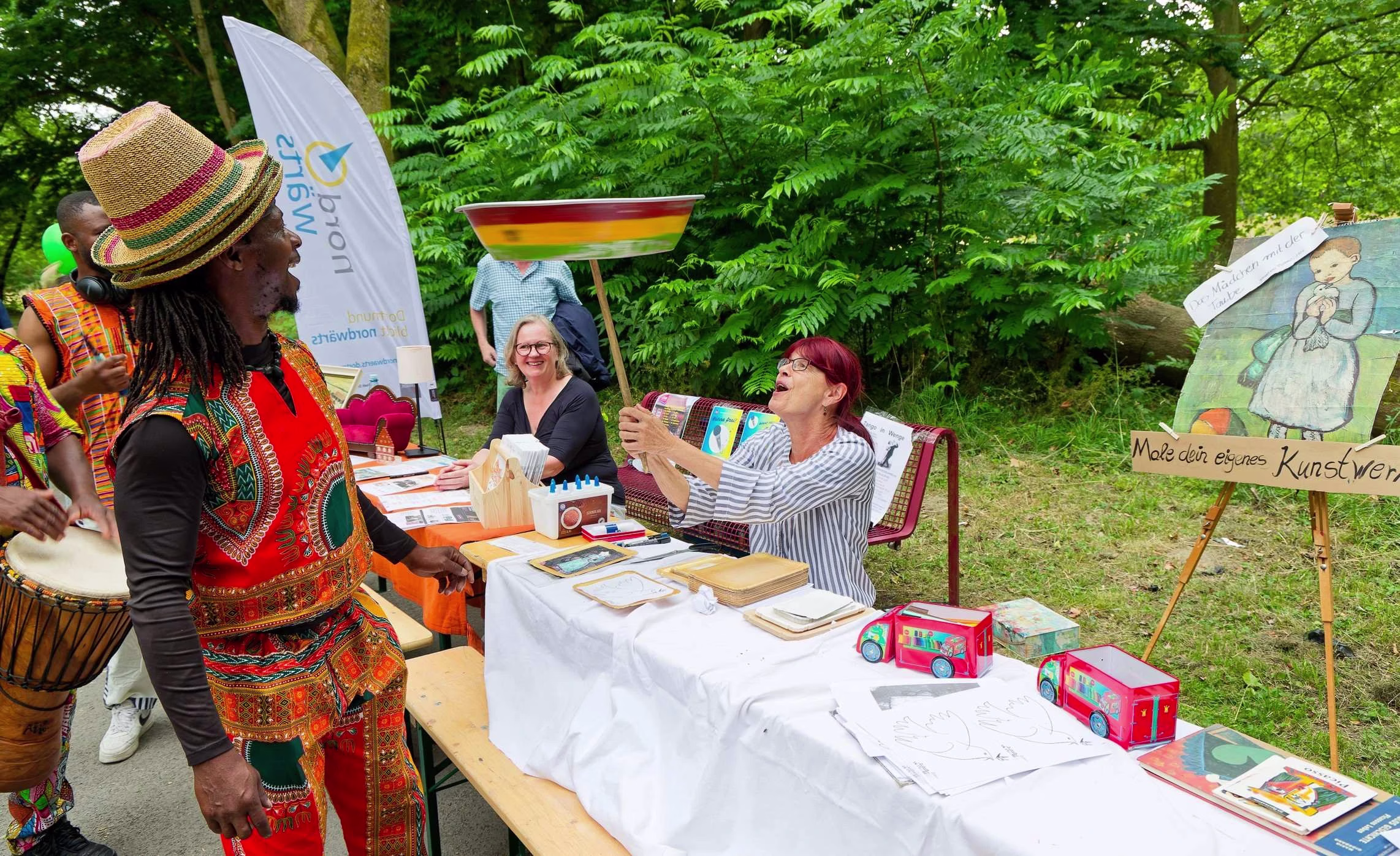 So viele fröhliche Menschen jeden Alters – so viele Nationen – so viel Kreativität – UND SOOO viel Spaß. Der Tag der Dritten Orte 2025 mit der langen Tafel durch Lanstrop und machte es möglich. Beinahe 30 Initiativen, Vereine und Gruppen aus Lanstrop und Umgebung, hatten ihre Tische für die lange Tafel gedeckt. Tisch an Tisch schlängelte sich dabei vom Haus, durch den Wengepark bis zur Färberstraße. So wurde die Tischreihe zu einem bunten Gesamtkunstwerk. Musikalisch begleitet wurde der Nachmittag vom Kezmer-Trio „Nefesch“, das zum Tanzen auf der Wiese einlud. Für Staunen sorgte „A.I.O.P“ mit afrikanischer Percussion und Mitmach-Akrobatik.