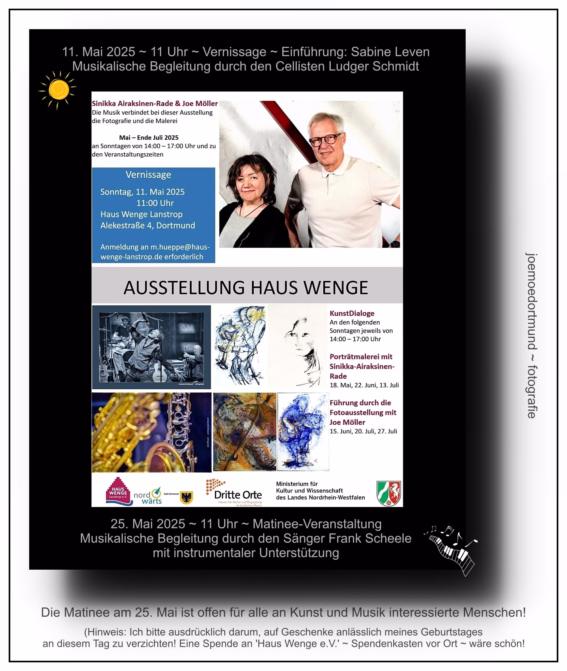 Die Ausstellung kann man während der Veranstaltungen in Haus Wenge besichtigen und natürlich auch, während „Auf´n Kaffee“ an den Sonntagen zwischen 14:00 und 17:00 Uhr. Im Rahmen der KunstDialoge am 18. Mai, 22. Juni und 13. Juli wird Sinikka ihre Kunst der Porträtzeichnung präsentieren. Führungen durch die Fotoausstellung mit Joe finden am 15. Juni, 20. Juli und 27. Juli statt.
