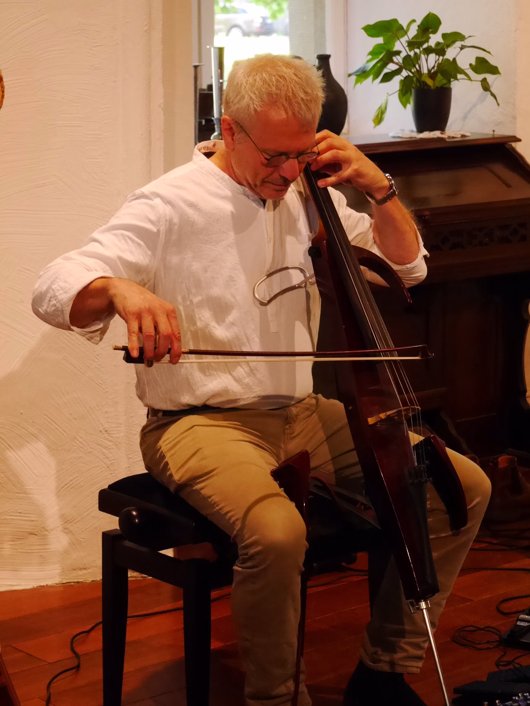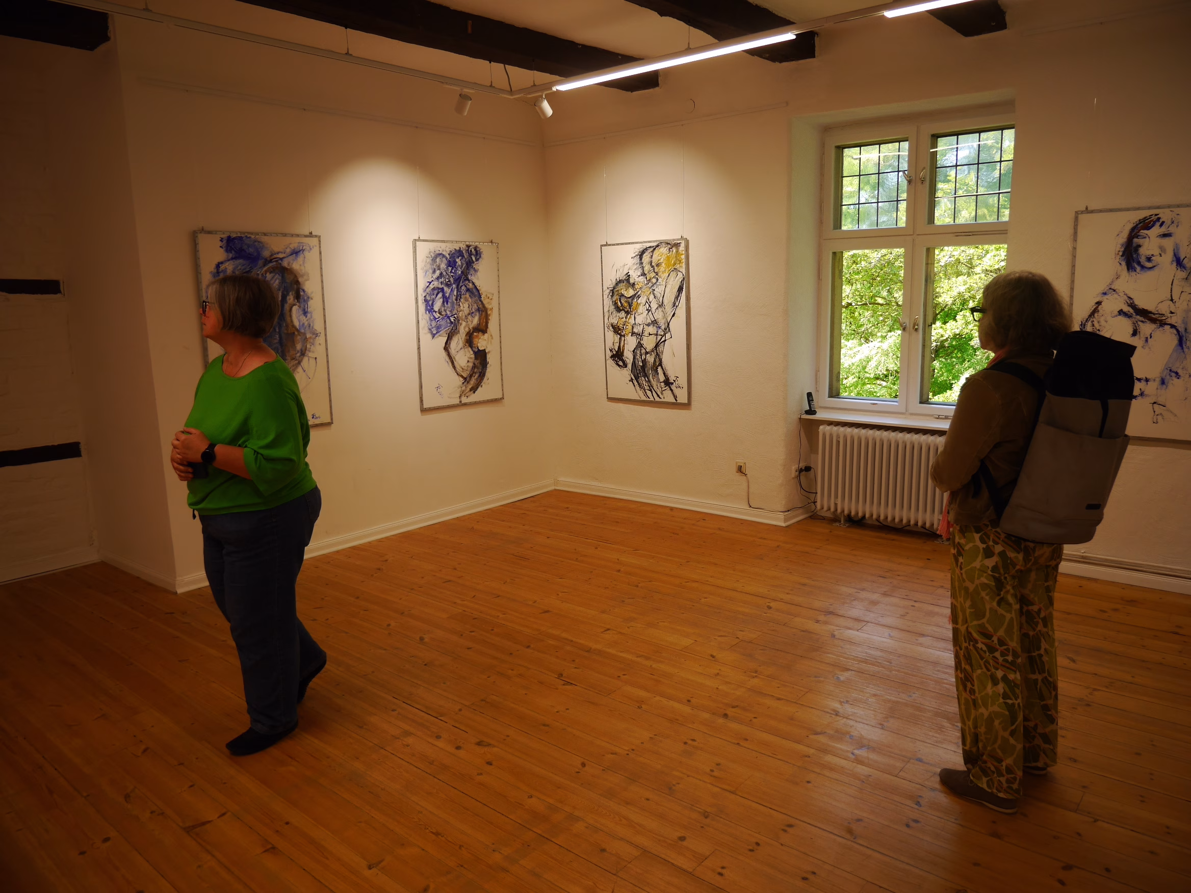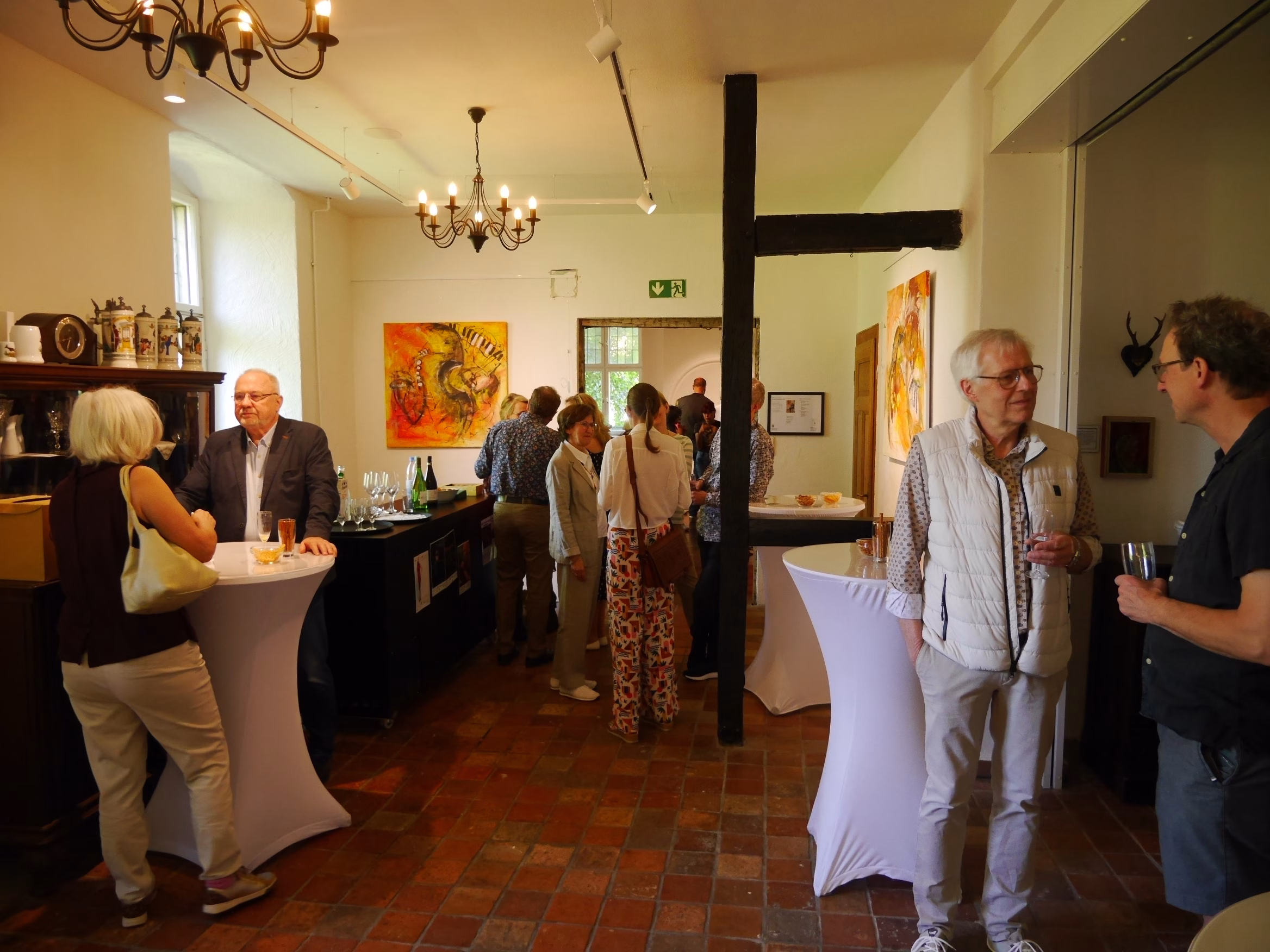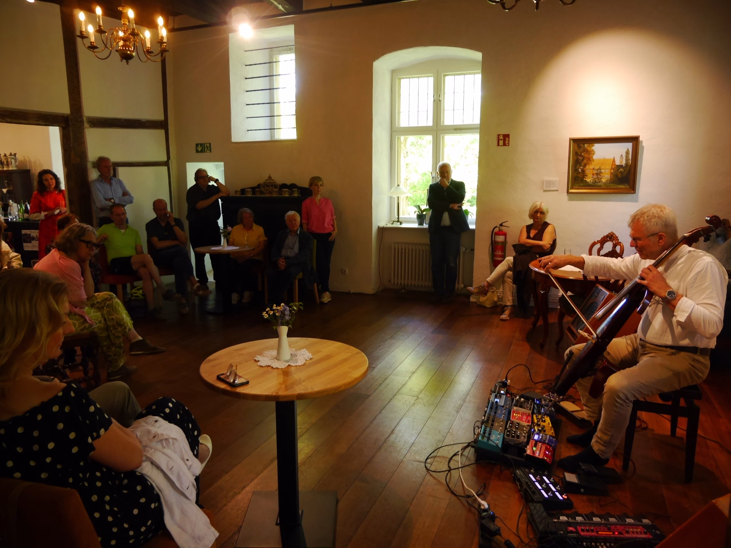 Die stimmungsvolle Vernissage am 11. Mai 2025 eröffnete der Cellist Ludger Schmidt. Die fachliche Einführung übernahm die Dortmunder Künstlerin Sabine Leven.