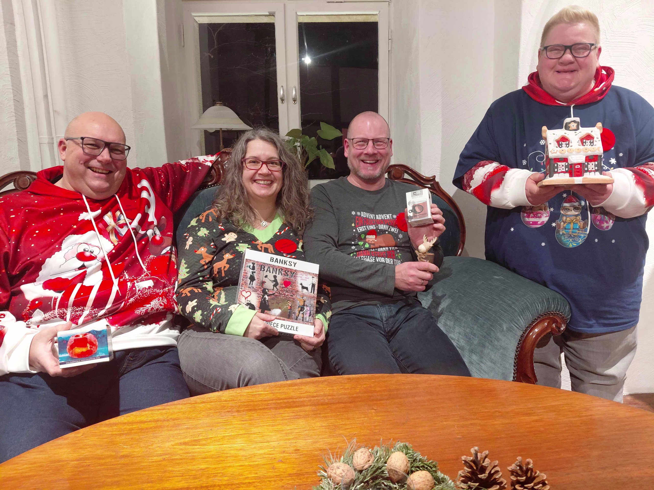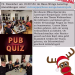Es war eigentlich zunächst nur als Zusatztermin für die beliebte Pubquizreihe in Haus Wenge gedacht.  Mit Blick auf das Datum kam bei den Organisatoren Sabine Schwalbert und Matthias Hüppe dann die Idee auf, ein Weihnachtsspecial daraus zu machen. Alle Gäste sollten sich entsprechend verkleiden – ob Weihnachtspullover, Weihnachtsmütze oder Rentiergeweih – alles war möglich. Dazu sollte es natürlich Kekse und Glühwein geben. Auch ein Schrottwichtelgeschenk sollten die Quizfans mitbringen.