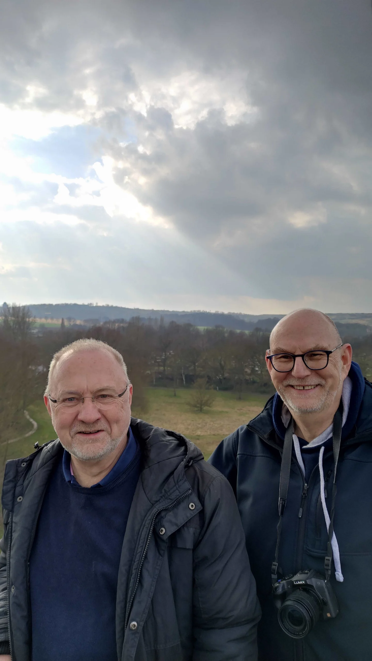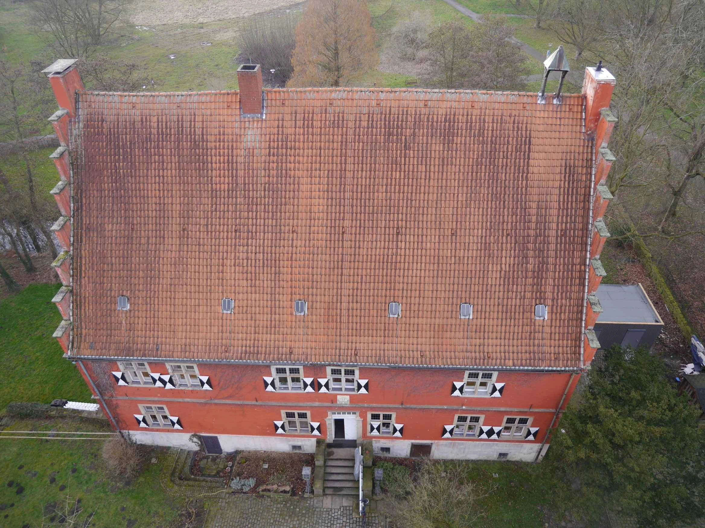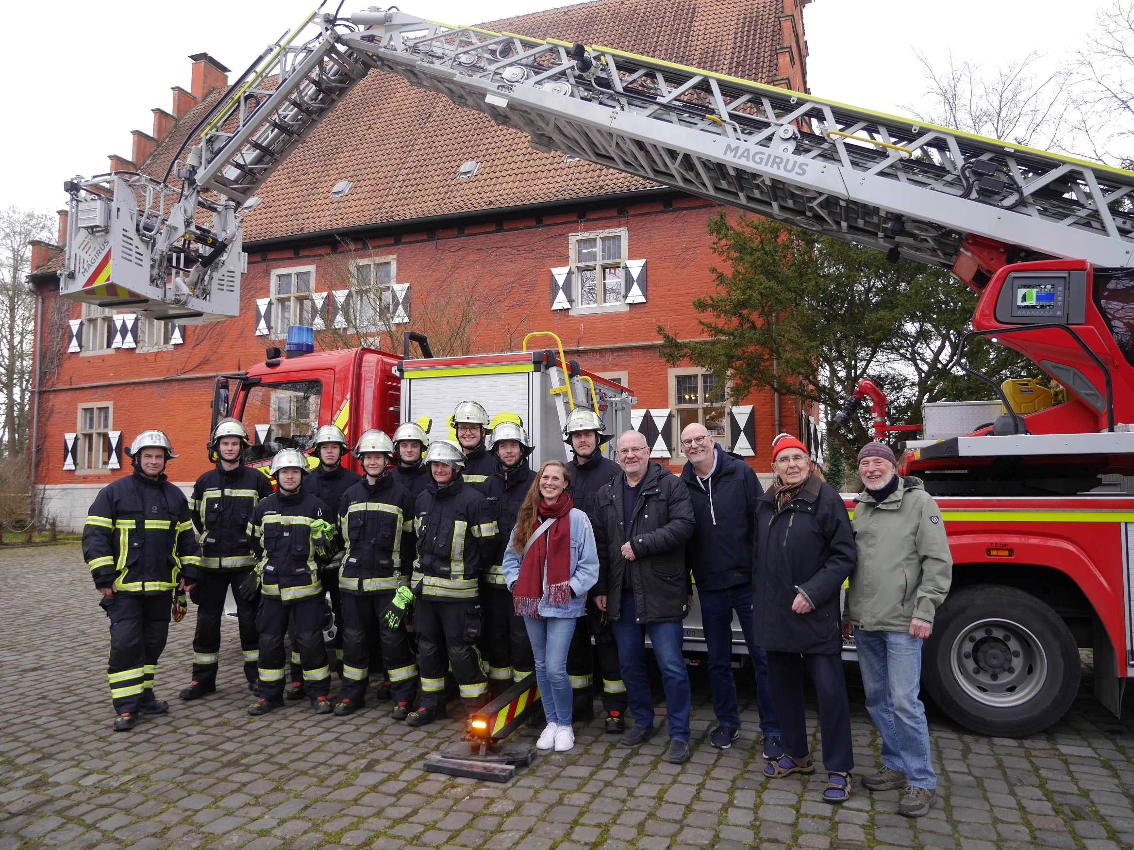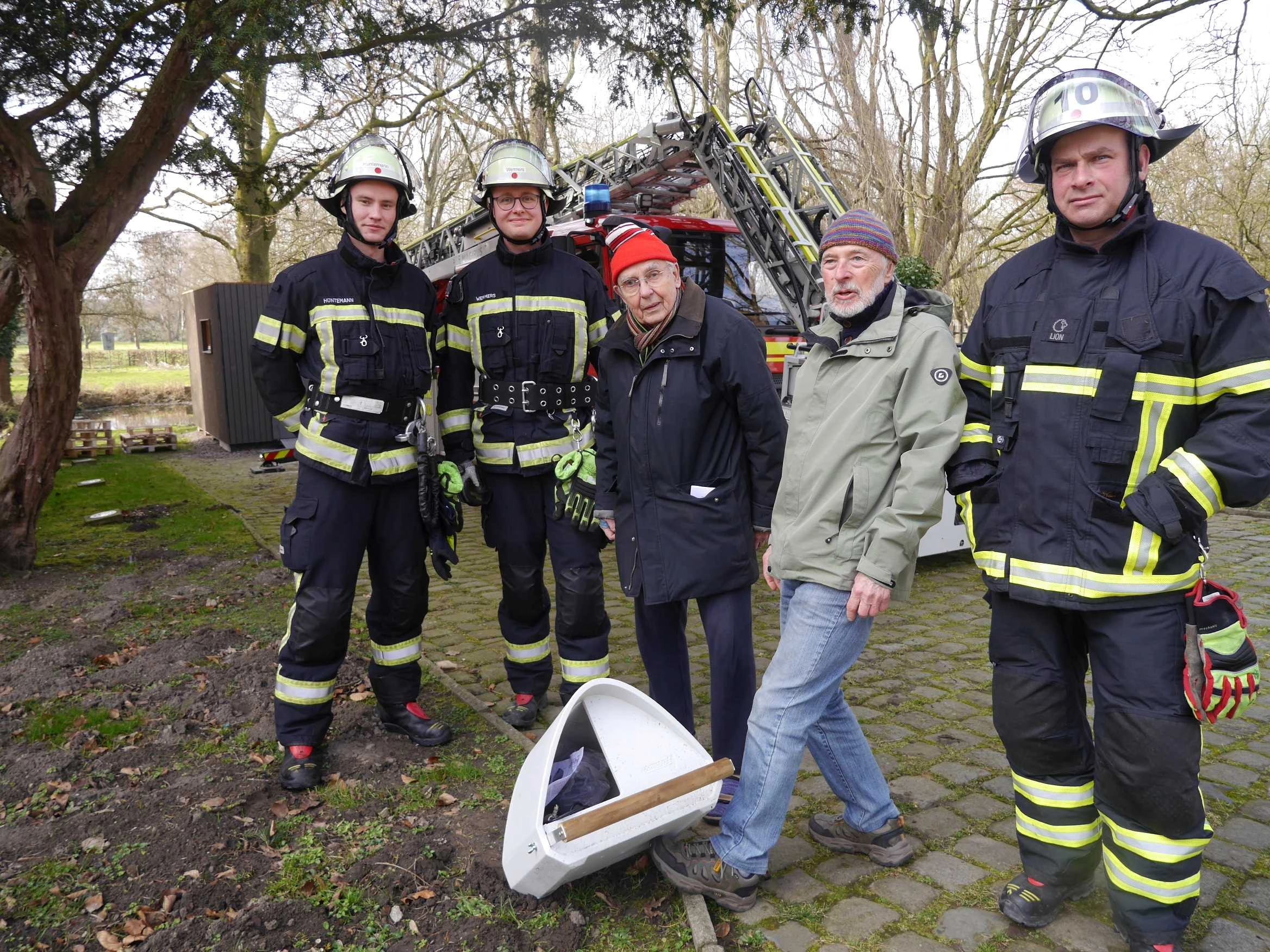 Die Aktion passt auch wunderbar zum Wenge-Satzungsziel der Ökologie. Günter Hagenhoff und Matthias Hüppe vom Wengevorstand nahmen dann auch gerne noch das Angebot an, mit dem Einsatzfahrzeug der Feuerwehr Haus Wenge mal von oben in Augenschein zu nehmen. Aus luftiger Höhe gab es eine ganz andere Perspektive und so konnte auch das alte Glockentürmchen auf dem Dach inspinziert werden,