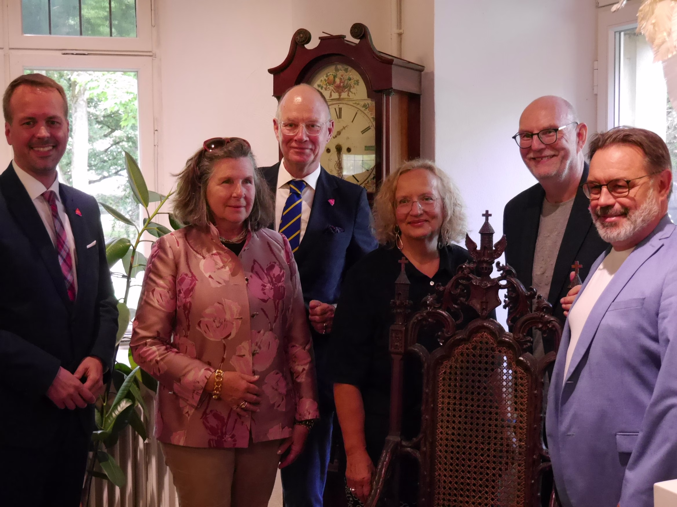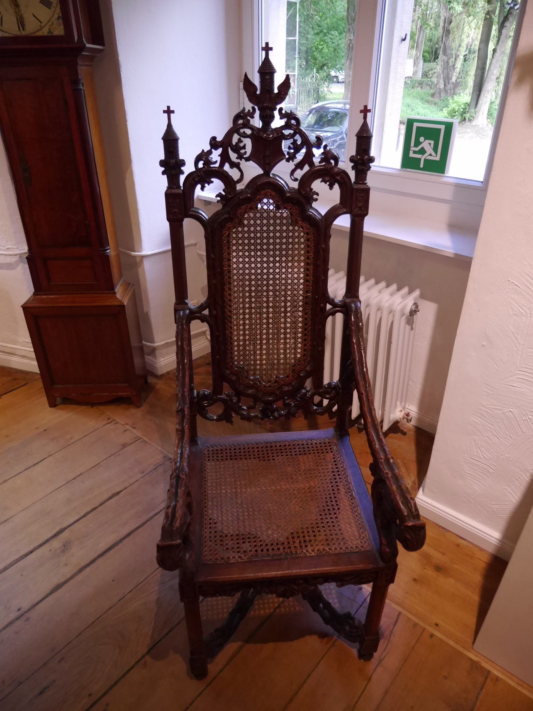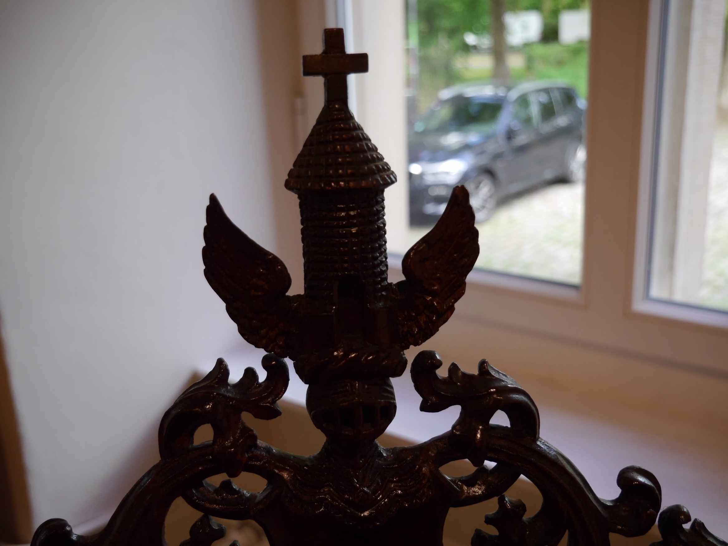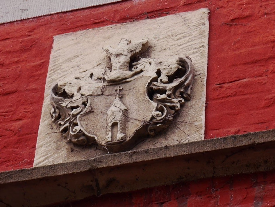 Aus Anlass der Rückführung des Wengeschen Wappenstuhles durch Nikolaus Graf Lambsdorff  hier ein bisschen Heraldik. Das Wappen der Freiherren von Wenge gibt es in verschiedenen Varianten (siehe auch Bild vom  Siegelring der Grafen von Lambsdorff). Es zeigt einen  Torturm mit geöffnetem Fallgitter und ein oder mehreren Spitzdächern, darauf je ein rechtshin wehendes Fähnchen. Der Turm steht dabei oft auf einem Helm, der zwischen einem offenen schwarzen Flug (Bezeichnung für beide Flügel eines Vogels in der Heraldik).
